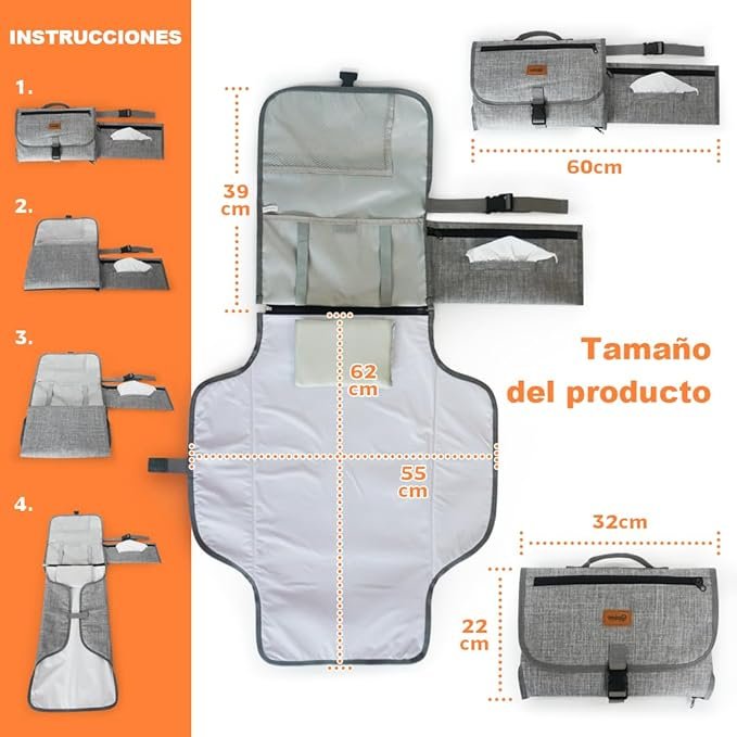 - TAMAÑO PERFECTO: El cambiador bebe tiene unas medidas de 64 x 34cm, ideal para el tamaño de un bebe. Plegado ocupa poca espacio para poder guardarlo perfectamente en tu bolsa de pañales. Con cierre de velcro.