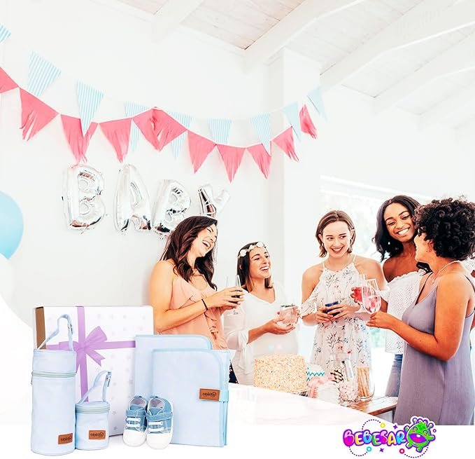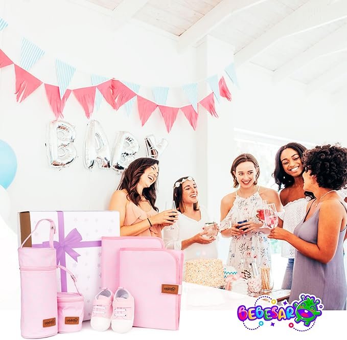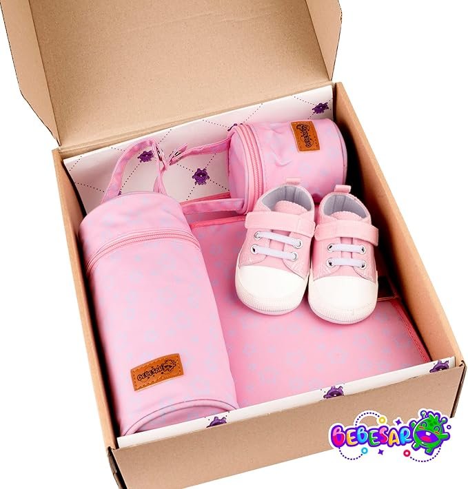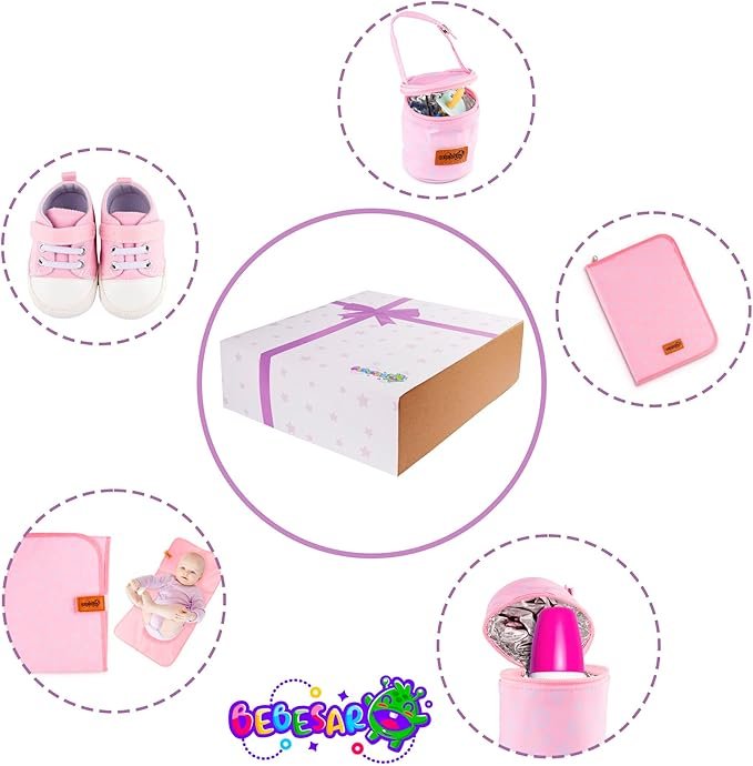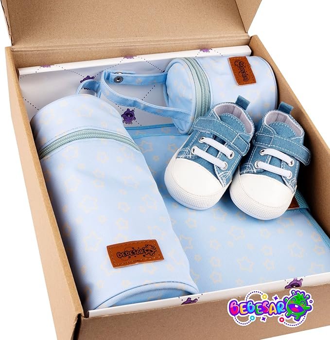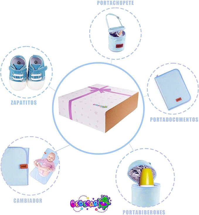 • CESTA BEBE – La canastilla para bebe recién nacido de Bebesar está compuesta de un set a juego de Portadocumentos, Cambiador, Portachupetes, Portabiberones y Zapatillas de bebé.